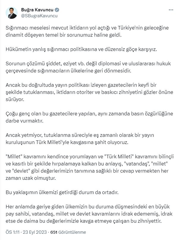 İYİ Parti İstanbul Milletvekili Buğra Kavuncu, tutuklamalara sosyal medya hesabından tepki gösterdi.