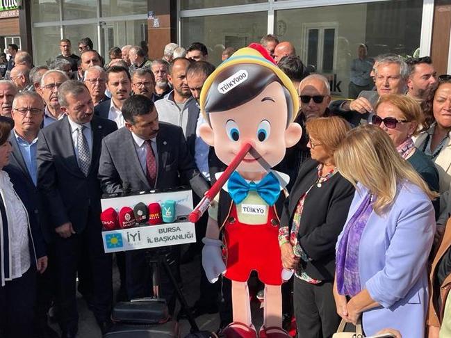 TÜİK’in açıkladığı enflasyon rakamlarının gerçeğin yarısını bile yansıtmadığını savunan İYİ Partililer, Bursa'da TÜİK'in kapısına pinokyo maketi bıraktı.