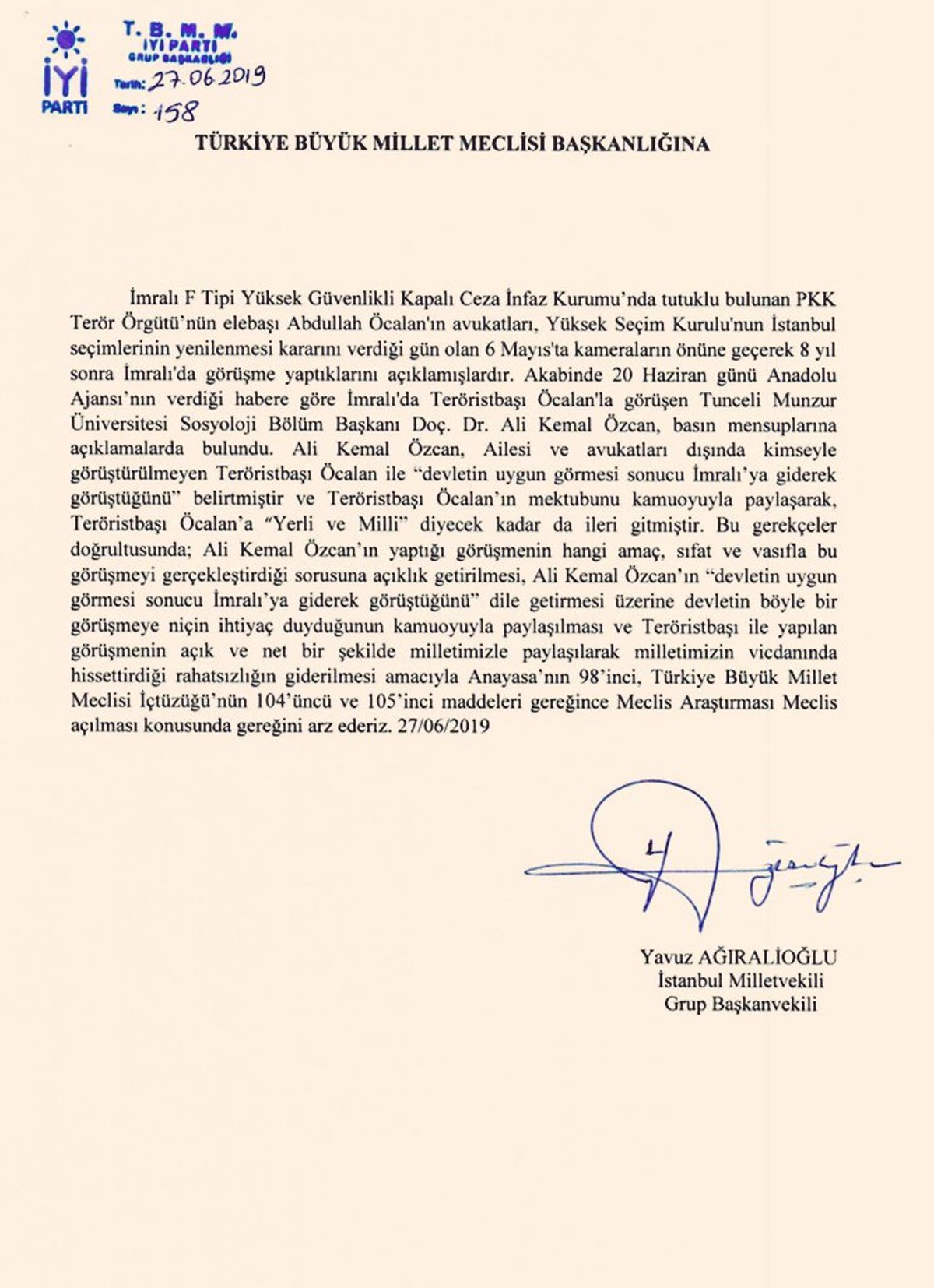 İYİ Parti'nin TBMM grubundan yapılan açıklamada, "Grup Başkanvekilimiz ve İstanbul Milletvekilimiz Yavuz Ağıralioğlu tarafından Meclis Başkanlığına sunulan "Ali Kemal Özcan'ın teröristbaşı öcalan ile görüşmüş olması" hakkındaki önergemiz Ak Parti'nin ret oyu kullanması neticesinde kabul edilmemiştir" ifadeleri kullanıldı.