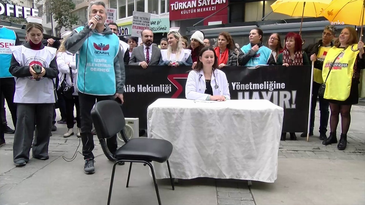 Aile Hekimliği Sözleşme ve Ödeme Yönetmeliği'ni iptali talebiyle 6-10 Ocak arasında greve giden sağlık çalışanları, grevin ikinci gününde İzmir Tabip Odası önünden Türkan Saylan Kültür Merkezi’ne yürüyüş gerçekleştirdi. Sağlık emekçileri yürüyüşün ardından iki dakikalık muayene süresini tiyatro gösterisi ile protesto etti. Vatandaşlara taleplerini ve neden grevde olduklarını anlatarak bildiri dağıttı. Sağlık çalışanları, Sağlığa bakan aranıyor”,“Birleşe birleşe kazanacağız”, “Bakanlık elini reçetemden çek” sloganları attı.