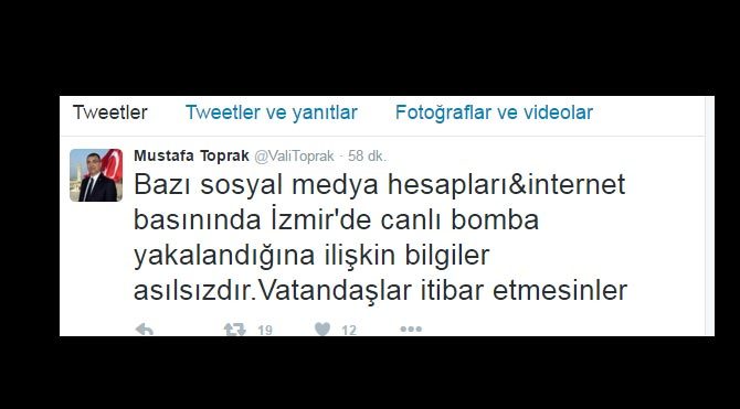 İzmir'de canlı bomba yakalandığı yönünde iddialar üzerine Vali Mustafa Toprak Twitter hesabından açıklama yaptı. Vali Toprak yaptığı paylaşımda, "Bazı sosyal medya hesapları internet basınında İzmir'de canlı bomba yakalandığına ilişkin bilgiler asılsızdır. Vatandaşlar itibar etmesinler" ifadelerine yer verdi.