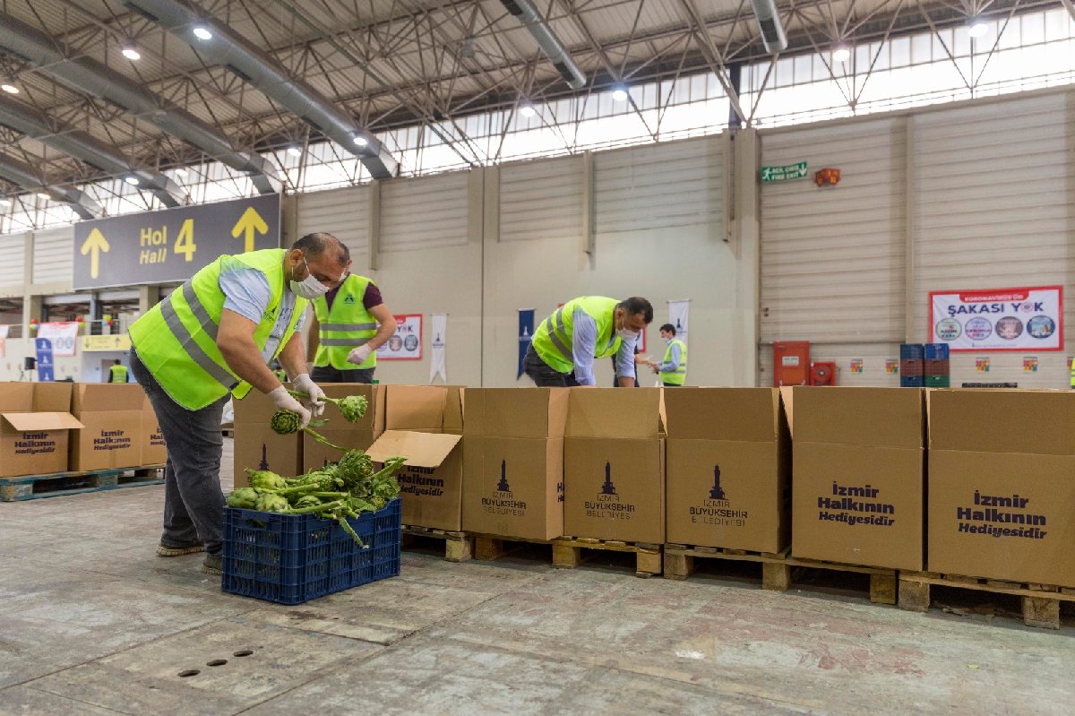 Salgın günlerinde İzmir Büyükşehir Belediyesi’nin kooperatiflerden aldığı 50 bin adet taze enginar, 65 bin kilogram bakla, 65 bin kilogram bezelye, 30 bin adet marul gıda paketlerine eklendi.