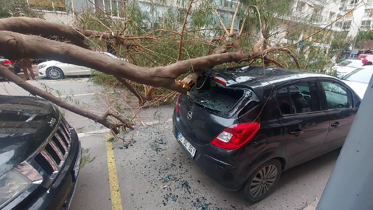 Kentte gün boyu etkisini sürdüren kuvvetli rüzgar, hayatı olumsuz etkiledi. Saatteki hızı zaman zaman 55 kilometreyi bulan kuvvetli rüzgar nedeniyle Konak ilçesindeki Plevne Bulvarı'nda bir ağaç, park halindeki araçların üzerine devrildi.
