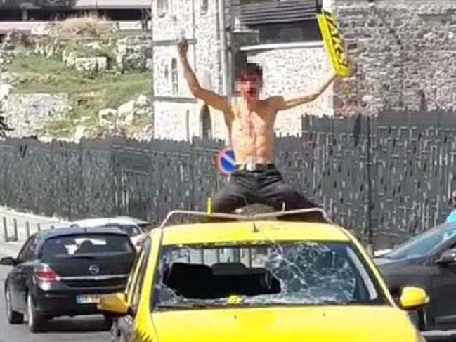 İzmir'in Konak ilçesinde, uyuşturucu maddenin etkisinde olduğu iddia edilen bir genç, durağan trafikte ilerleyen bir taksiye saldırdı. Taksinin üzerine çıkan ve ön camlarını kıran genç, ambulansla ve polis nezaretinde hastaneye kaldırıldı. Olay, çevredeki vatandaşlar tarafından cep telefonuyla görüntülendi.