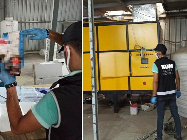 İş yerinde ayrıca 500 lile 10 bin litre kapasiteli 7 tank, 1 arıtma makinesi, çeşitli markalara ait 97 bin etil alkol etiketi, 105 bin hologram, koli sarma makinesi, folyo kapatma makinesi, 200 adet 1 litrelik plastik şişe, 7 bin 240 adet 5 litrelik bidon da ele geçirildi.