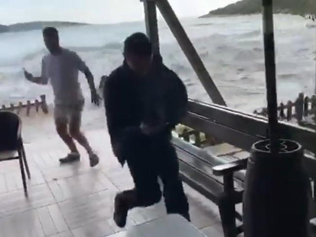 Çevredeki vatandaşlar deniz suyuna yakalanmamak için koşarak kaçıyor.