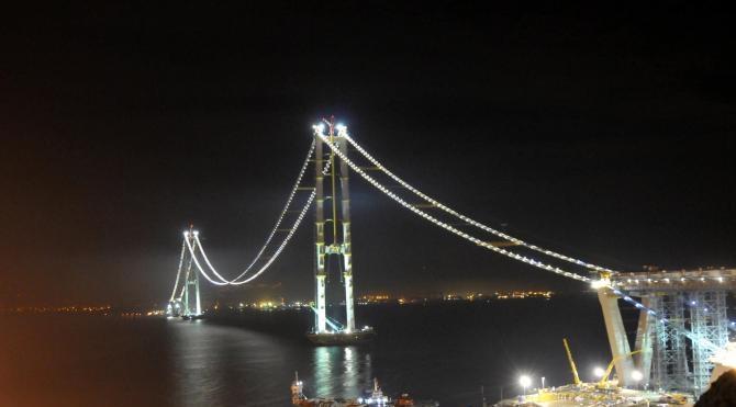 İstanbul ile İzmir arasındaki yolculuğu 3.5 saate indirmesinin yanı sıra TEM`in İzmit Körfezin etrafındaki D-100 ve E-130 Karayolları`ndaki trafiği de büyük ölçüde rahatlatacak Gebze-Orhangazi-İzmit Otoyolu`nun en önemli geçiş güzergahlarından 2 bin 682 metre uzunluğundaki İzmit Körfez Geçişi Köprüsü inşaatı hızla devam ediyor. İzmit Körfez Geçişi Köprüsü Eylül ayında yapılan `kedi yolu` çalışmaları ardından ışıklandırılınca ortaya görsel şölen çıktı. İzmit Körfezi çevresindeki yerleşim yerlerinin ışıkları, körfezden geçen gemiler ve köprünün ışıklarının bütünleşmesi muhteşem bir görüntü ortaya çıkardı. Gece, D-100 Karayolu ve TEM`den geçenler köprünün oluşturduğu güzelliği izliyor.