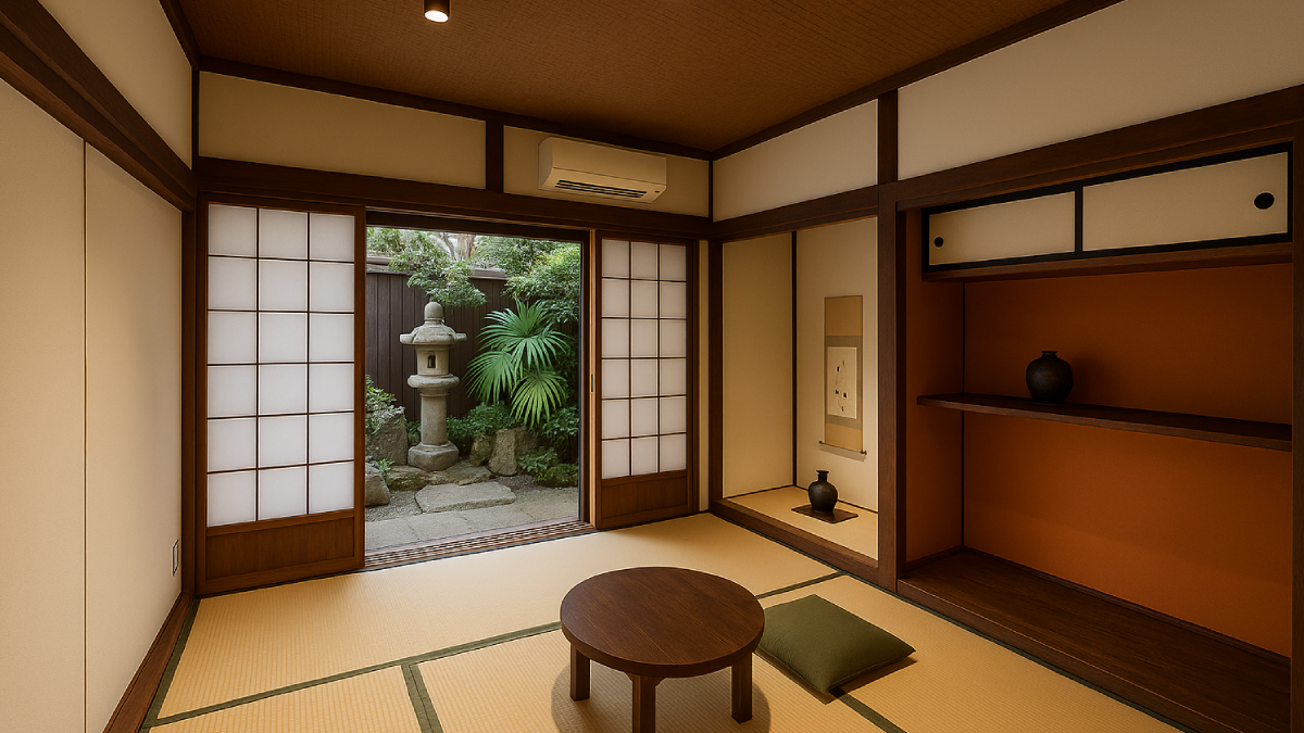 Tatami adı verilen doğal sazdan yapılan yer döşemeleri, odada net sınırlar ve düzen oluşturur. Bu da mekânın daha düzenli ve ferah algılanmasına yardımcı olur.