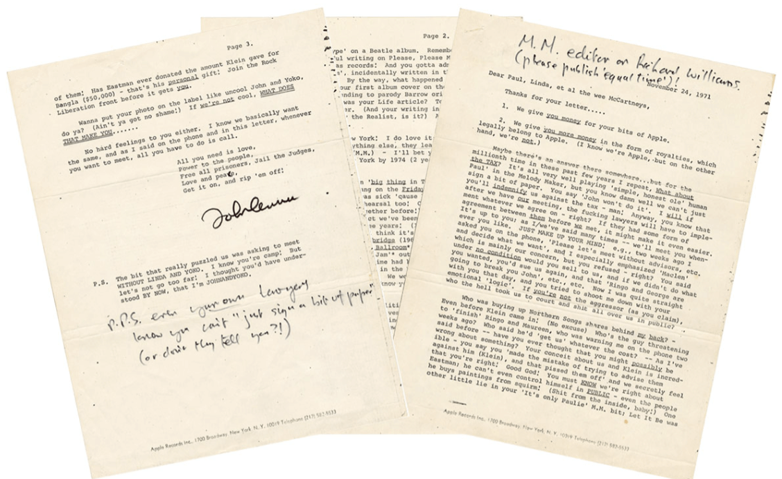 "Takıntılı eski dostum"a diye hitap eden Lennon, "Çok iyi, ama çok iyi biliyorsun ki sadece bir kağıt imzalayamayız. Eğer (iddia ettiğin gibi) saldırgan değilsen, kim bizi mahkemeye çıkardı ve herkesin içinde üzerimize çullandı? Daha önce de söylediğim gibi bir konuda yanılmış olabileceğini hiç düşündün mü?" diye yazıyor.