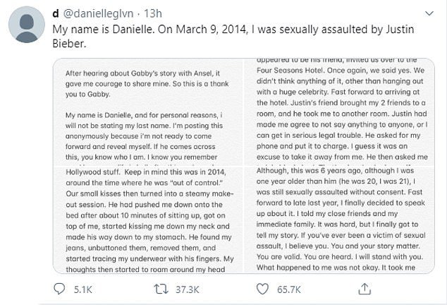 Danielle yayınladığı mesajda, "Arkadaşlarımla gece boyu eğleniyorduk. Daha sonra bir adam yanımıza yaklaşıp Justin Bieber ile tanışmak isteyip istemediğimizi sordu. Tabii ki evet deyip kabul ettik" dedi. 2014'te kendisinin 21, Justin'in ise 20 yaşında olduğunu söyleyen Danielle, ardından Bieber tarafından kendisi ve arkadaşlarının otel odasına davet edildiğini söyledi.