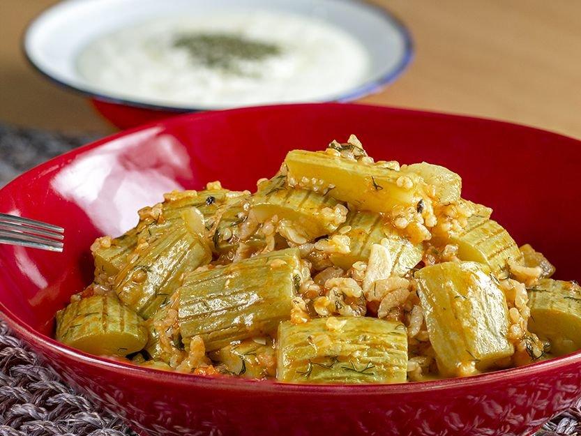 Soğanları yemeklik doğrayın ve yağda kavurun. Üzerine küçük küçük doğradığınız biberleri de ekleyin. Domatesleri de doğrayıp üzerine ekleyin. Bunlar hafif kavrulunca doğradığınız kabakları ilave edin. Sarımsakları ve yıkadığınız pirinçleri de ekleyin.
