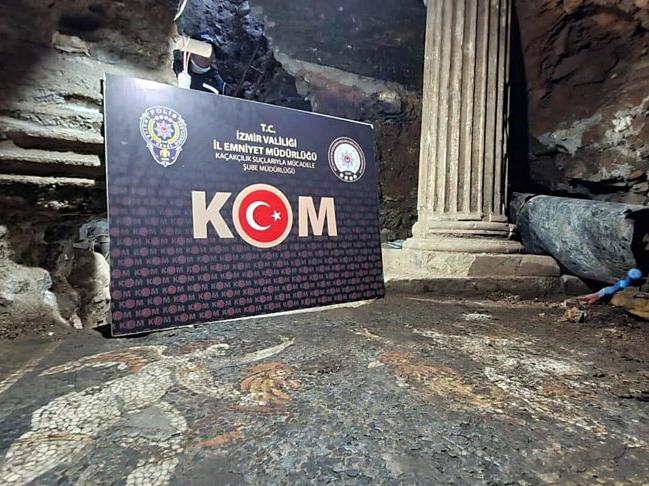 İzmir'in Konak ilçesinde bir evin bahçesinde kaçak kazı yapanlara yönelik düzenlenen operasyonda Romalı bir zengine ait olduğu değerlendirilen ve 'ihtişamı' simgeleyen yaklaşık 2700 yıllık iki mozaik ele geçirildi.
