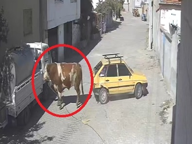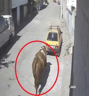 Uzun süre boğayı yakalamak için peşinden koşan sahibi, bir süre sonra hayvanı uyuşturucu iğneyle etkisiz hale getirdi. Boğanın otomobile zarar verdiği anlar, bir evin güvenlik kamerasına yansıdı.