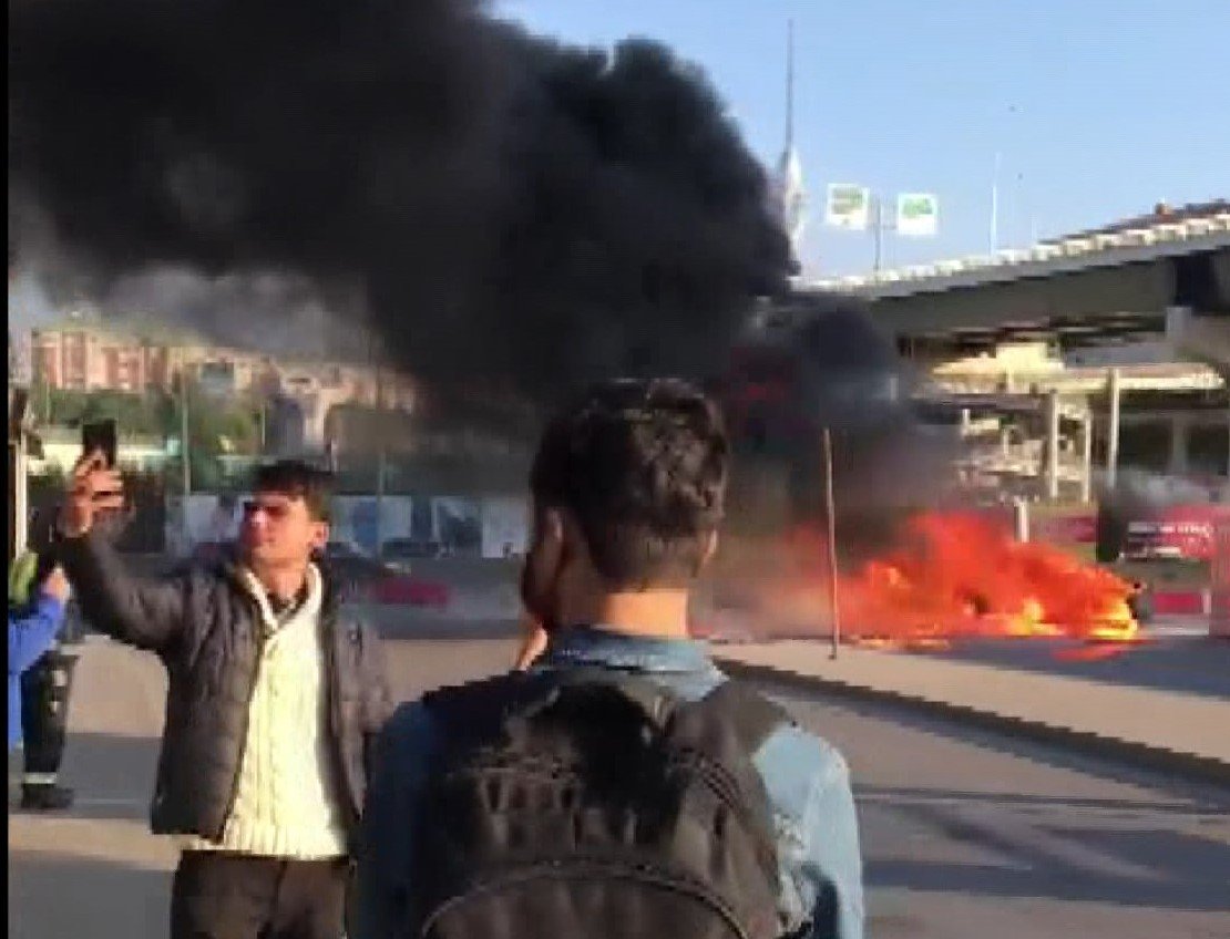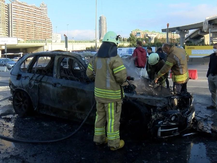 Kadıköy D-100 Karayolu'nda lüks bir cip alev alev yandı. İtfaiye ekipleri alevleri söndürürken, cip kullanılamaz hale geldi.