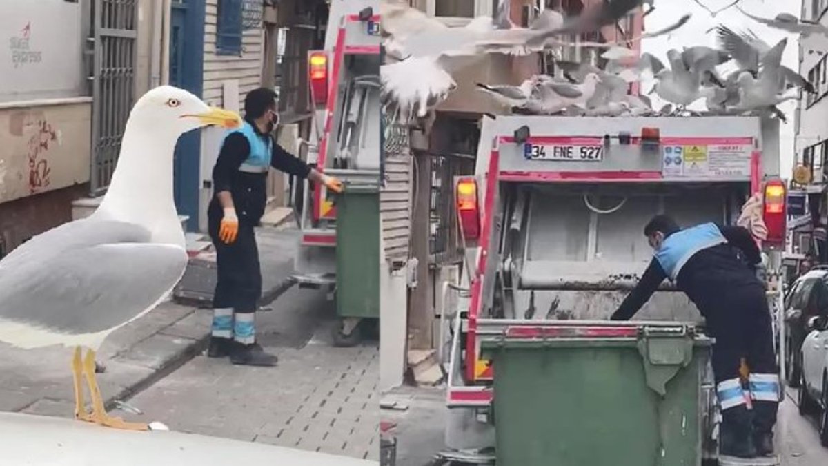 Kadıköy'de onlarca martı, çöp kamyonunun peşine takıldı. Temizlik görevlileri ise bir yandan çöpleri toplarken, bir yandan da çöpteki atıklarla peşlerinden gelen martıları besledi.