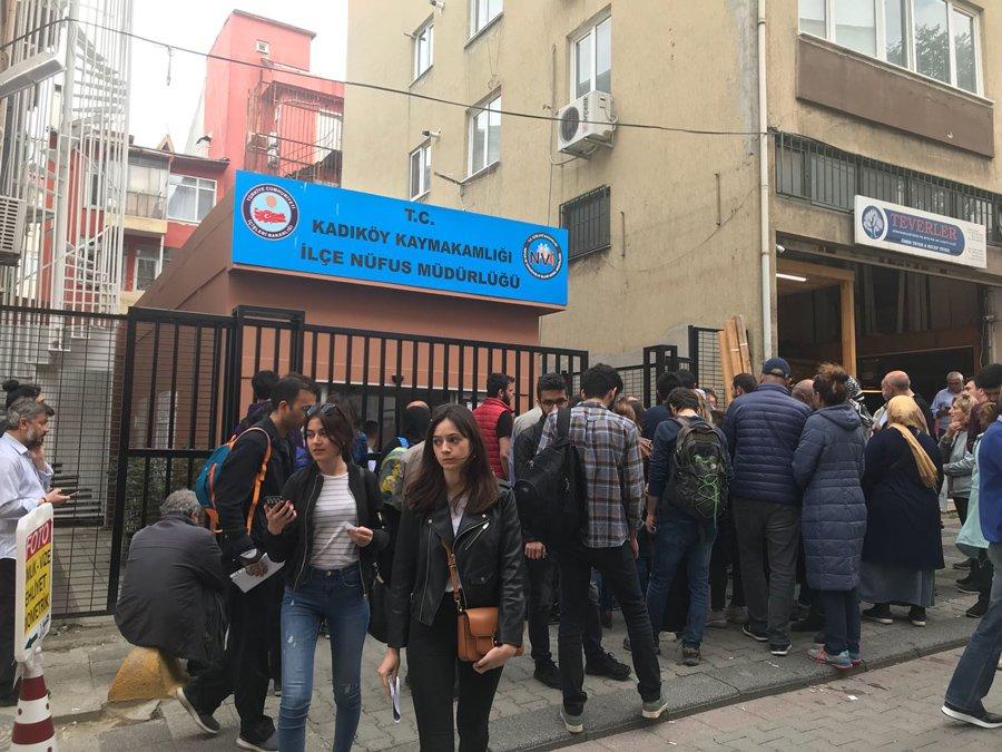 Kadıköy Nüfus Müdürlüğü binası önünde uzun kuyruklar hakim. Birçok Kadıköylü işlemlerini yetiştiremeyip seçimlerde oy kullanamama endişesi taşıyor.