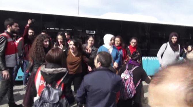 "8 Mart Dünya Emekçi Kadınlar Günü" dolayısıyla Kadıköy Rıhtım'da toplanan bir grup kadına polis müdahale etti. Kadıköy Rıhtım Meydanı'nda toplanan bir grup kadın, "8 Mart Dünya Emekçi Kadınlar Günü" dolayısıyla basın açıklaması yapmak istedi. Valilikten izin alınmadığını bildiren polis yetkilileri kadınların alandan dağılmalarını, aksi halde müdahale edileceğini söyledi. Alan, hem eylem yapmak isteyen kadınlara hem de gazetecilere kapatıldı. Bu sırada eyleme destek vermek isteyen bir grup kadın, sahil tarafından gelerek polis koridoru önünde sloganlar attı.