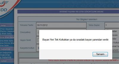 Erkek yolcular istedikleri pencere yanı, koridor veya internetli koltuk seçebiliyorken, kadın yolcular sadece TCDD'nin belirleyeceği koltuğa oturabiliyor. Kadınlar demiryollarının internet sitesinden koltuklarının yerini seçerek bilet satın almak istediklerinde, "Bayan yeri tek koltuktan ya da sıradaki bayan yanından verilir" uyarısıyla karşılaşıyor.