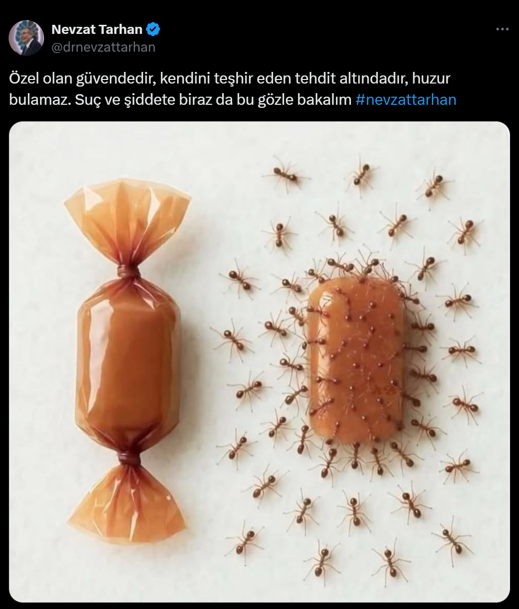 Nevzat Tarhan, sosyal medya hesaplarından yaptığı bir paylaşımla gündeme geldi. Tarhan’ın, “Özel olan güvendedir, kendini teşhir eden tehdit altındadır, huzur bulamaz. Suç ve şiddet olaylarına biraz da bu gözle bakalım” ifadelerini kullandığı paylaşımına tepki yağdı.