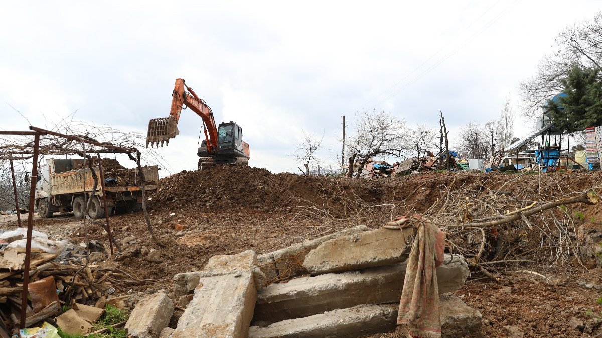 Yıkılan evlerin enkaz kaldırma çalışmaları ekipler tarafından sürdürülüyor.
