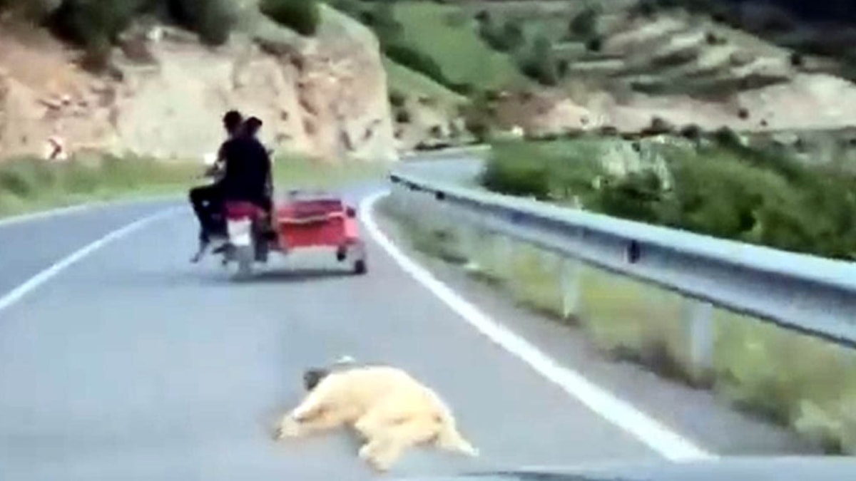 Alınan bilgiye göre kentte kaydedilen görüntülerde 2 kişi, kullandıkları sepetli motosikletin arkasına bağladıkları köpekle yolda ilerledi. Köpeğin hareketsiz halde sürüklendiği anlar, arkadan gelen otomobildeki kişi tarafından cep telefonuyla kayda alındı. Görüntüleri kaydeden kişi, motosikletin yanında durup, "Gençler ne yapıyorsunuz? Yazık günah değil mi?" diye tepki gösterdi. Motosikletin sürücü ise "Öldü" diye yanıt verdi.