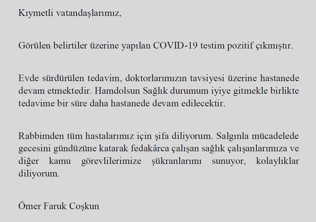 "Evde sürdürülen tedavim doktorların tavsiyesi üzerine hastanede devam etmektedir. Hamdolsun sağlık durumum iyiye gitmekle birlikte tedavime bir süre daha hastanede devam edilecektir. Rabbimden tüm hastalarımıza şifa diliyorum. Salgınla mücadelede gecesini gündüzüne katarak fedakarca çalışan sağlık çalışanlarımıza ve diğer kamu görevlilerimize şükranlarımı sunuyor kolaylıklar diliyorum" dedi. İHA