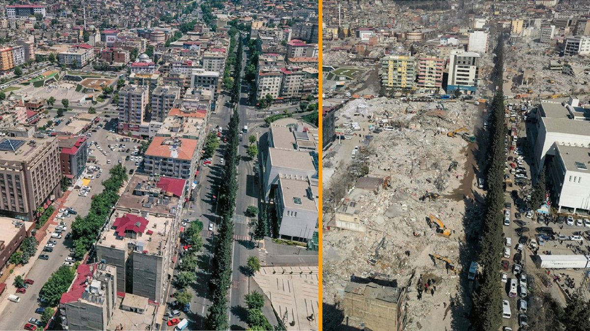 Ekibin deprem öncesi ve sonrasında aynı yerden çektikleri görseller, "asrın felaketi"nin kentte yarattığı yıkımı gözler önüne seriyor.