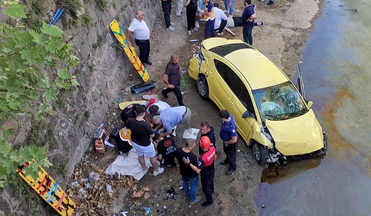 Ticari taksi, daha sonra korkuluklara çarparak dere yatağına devrildi. İhbar üzerine kaza yerine sağlık, itfaiye ve polis ekipleri sevk edildi.