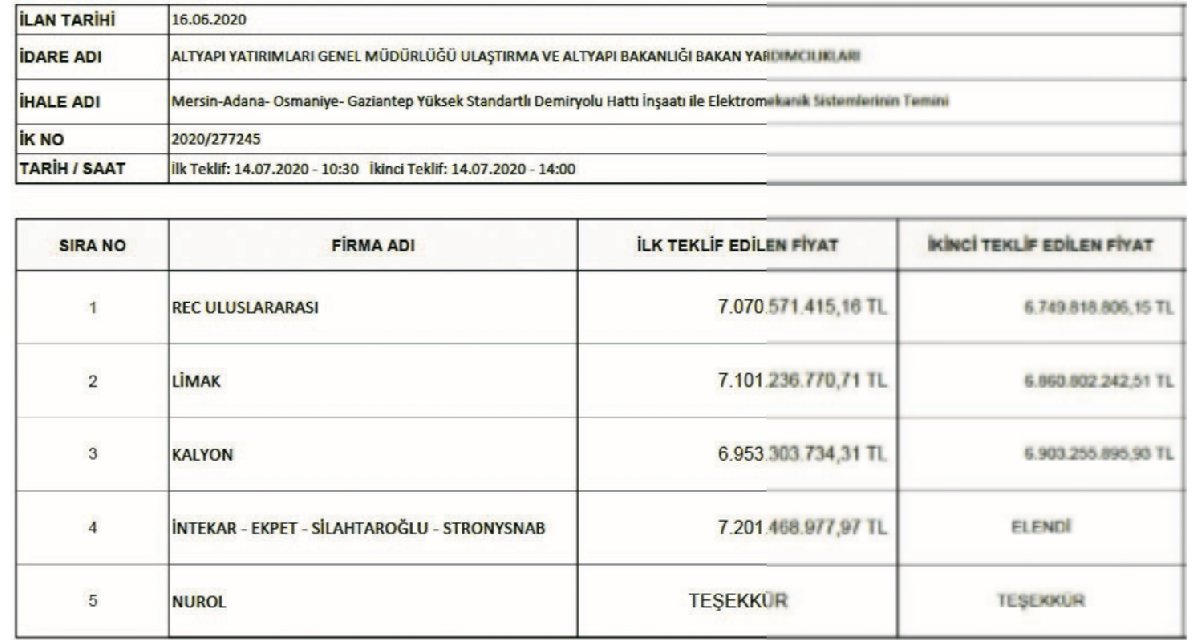 ‘Mersin-Adana-Osmaniye-Gaziantep Yüksek Standartlı Demiryolu Hattı İnşaatı ile Elektromekanik Sistemlerinin Temini İşi’ ihalesi de bu şekilde iki oturumda tamamlanmıştır. Toplam 5 firmanın katılımı ile gerçekleştirilen ihalenin ilk oturumunda firmamız en uygun teklif vermiştir ancak devamında gerçekleştirilen ikinci oturumda aşağıdaki tabloda da görüldüğü üzere firmamızın teklifi en düşük üçüncü teklif olmuş ve en düşük teklif Rec Uluslararası İnşaat Yatırım Sanayi ve Tic. A.Ş. firması tarafından verilmiştir.