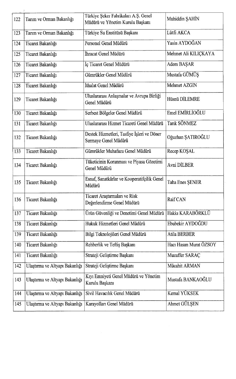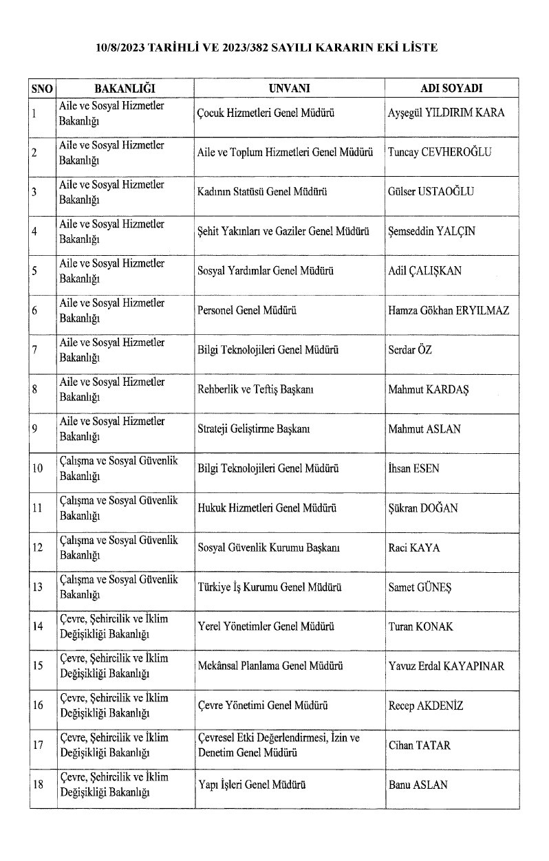 Kararlara göre, SGK Başkanlığı'na Raci Kaya, AFAD Başkanlığı'na Okay Memiş ve İŞKUR Genel Müdürlüğü'ne Samet Güneş, Nüfus ve Vatandaşlık İşleri Genel Müdürlüğü'ne, İbrahim Taşyapan; Teftiş Kurulu Başkanlığı'na, İbrahim Akın ve Sivil Toplumla İlişkiler Genel Müdürlüğü'ne, Mustafa İspirgil atandı.