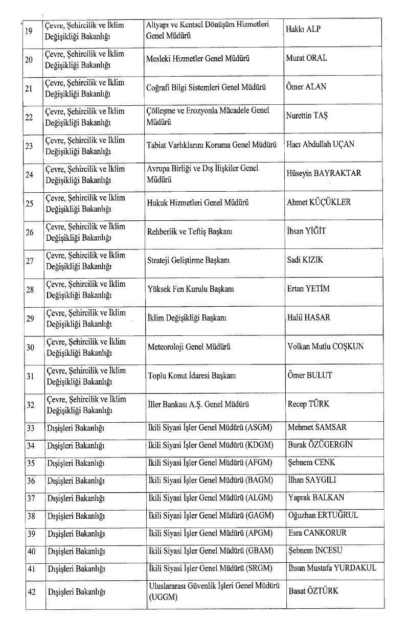 Devlet Tiyatroları Genel Müdürlüğü'ne, Tamer Karadağlı; Araştırma ve Eğitim Genel Müdürlüğü'ne, Selim Terzi; Bilgi Teknolojileri Genel Müdürlüğü'ne, Türkay Dalan; Güzel Sanatlar Genel Müdürlüğü'ne, Ömer Faruk Belviranlı; Personel Genel Müdürlüğü'ne, Nihat Umut Döktür; Sinema Genel Müdürlüğü'ne, Erkin Yılmaz; Strateji Geliştirme Başkanlığı'na, İhsan Çimen; Tanıtma Genel Müdürlüğü'ne, Timuçin Güler; Teftiş Kurulu Başkanlığı'na, İzzet Güven; Yatırım ve İşletmeler Genel Müdürlüğü'ne, Neşe Çıldık; Vakıflar Genel Müdürlüğü'ne, Sinan Aksu; Türk İşbirliği ve Koordinasyon Ajansı Başkanlığı'na, Serkan Kayalar; Yurtdışı Türkler ve Akraba Topluluklar Başkanlığı'na, Abdullah Eren ve Çanakkale Savaşları Gelibolu Tarihi Alan Başkanlığı'na, İsmail Kaşdemir.