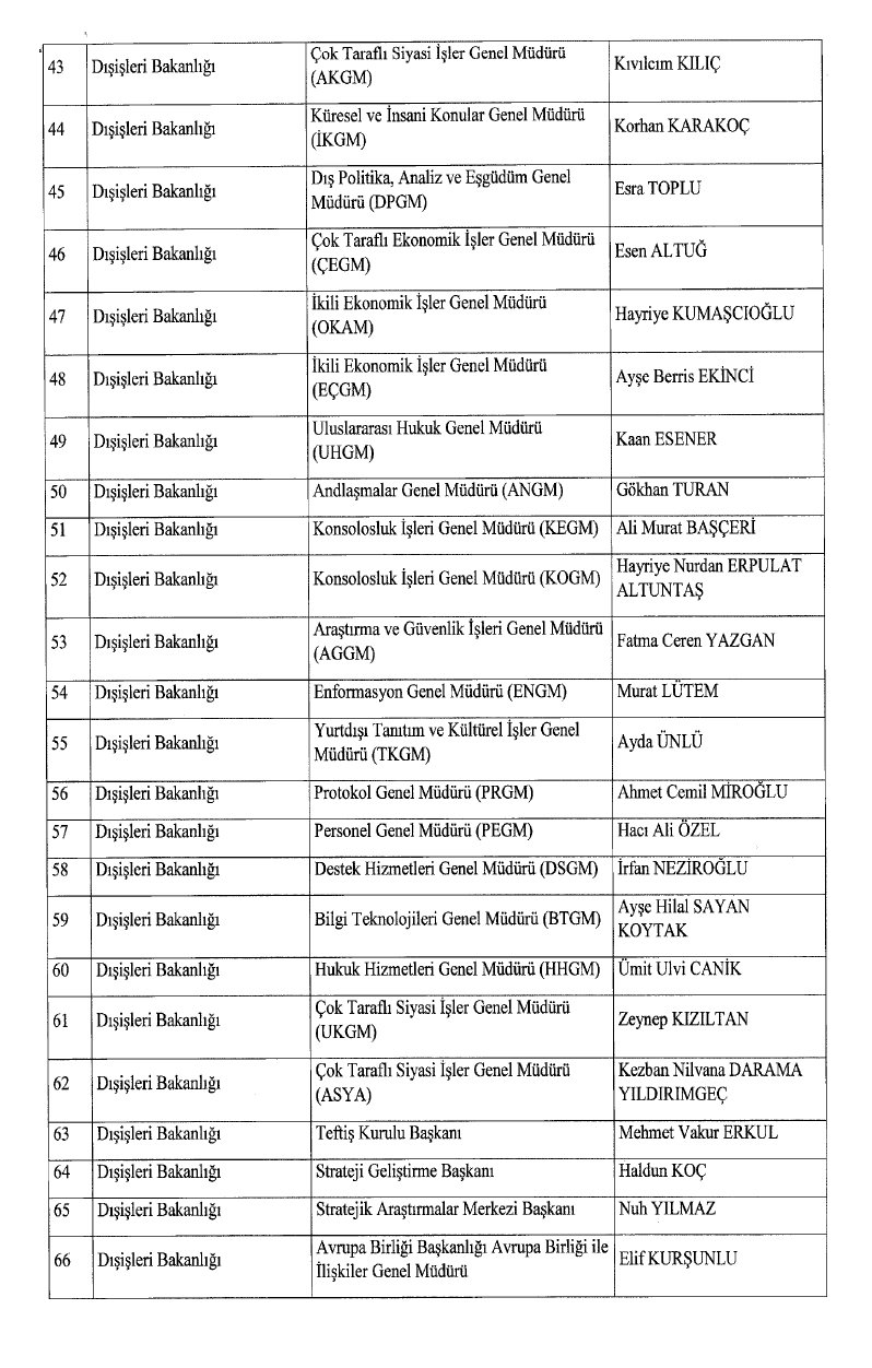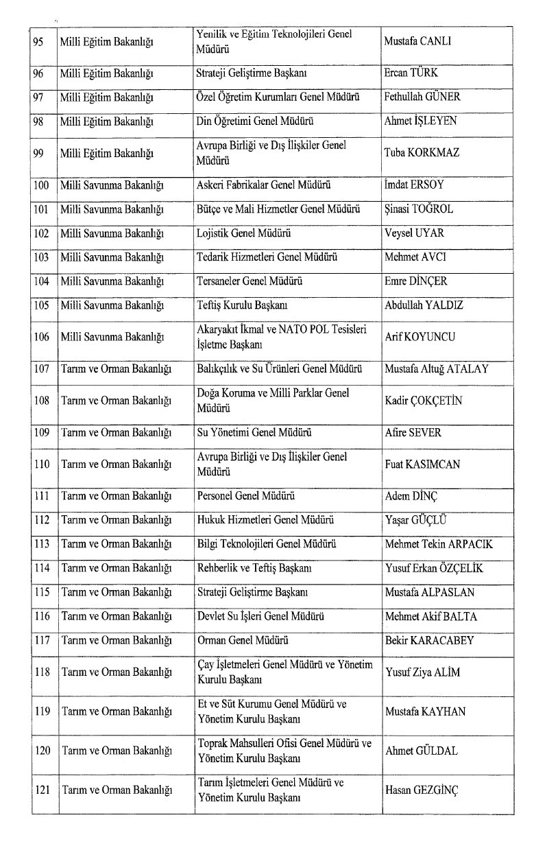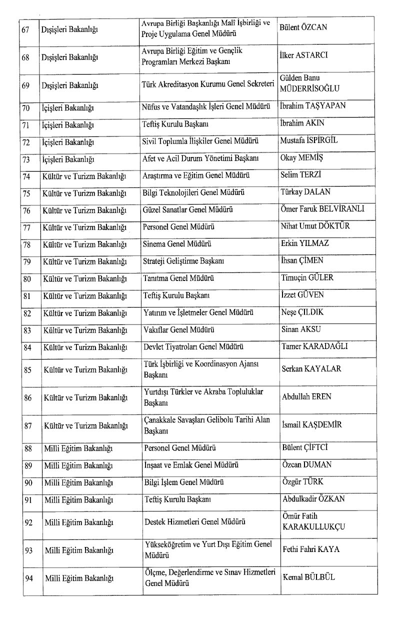"Personel Genel Müdürlüğü'ne, Bülent Çiftci; İnşaat ve Emlak Genel Müdürlüğü'ne, Özcan Duman; Bilgi İşlem Genel Müdürlüğü'ne, Özgür Türk; Teftiş Kurulu Başkanlığı'na, Abdulkadir Özkan; Destek Hizmetleri Genel Müdürlüğü'ne, Ömür Fatih Karakullukçu; Yükseköğretim ve Yurt Dışı Eğitim Genel Müdürlüğü'ne, Fethi Fahri Kaya; Ölçme, Değerlendirme ve Sınav Hizmetleri Genel Müdürlüğü'ne, Kemal Bülbül; Yenilik ve Eğitim Teknolojileri Genel Müdürlüğü'ne, Mustafa Canlı; Strateji Geliştirme Başkanlığı'na, Ercan Türk; Özel Öğretim Kurumları Genel Müdürlüğü'ne, Fethullah Güner; Din Öğretimi Genel Müdürlüğü'ne, Ahmet İşleyen; Avrupa Birliği ve Dış İlişkiler Genel Müdürlüğü'ne, Tuba Korkmaz." (DHA)