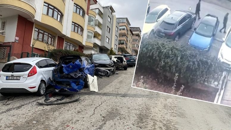 Ankara'da dün yokuşta geri kayan kamyonetin park halindeki 11 araca çarpıp devrildiği kazanın güvenlik kamerası görüntüleri ortaya çıktı.