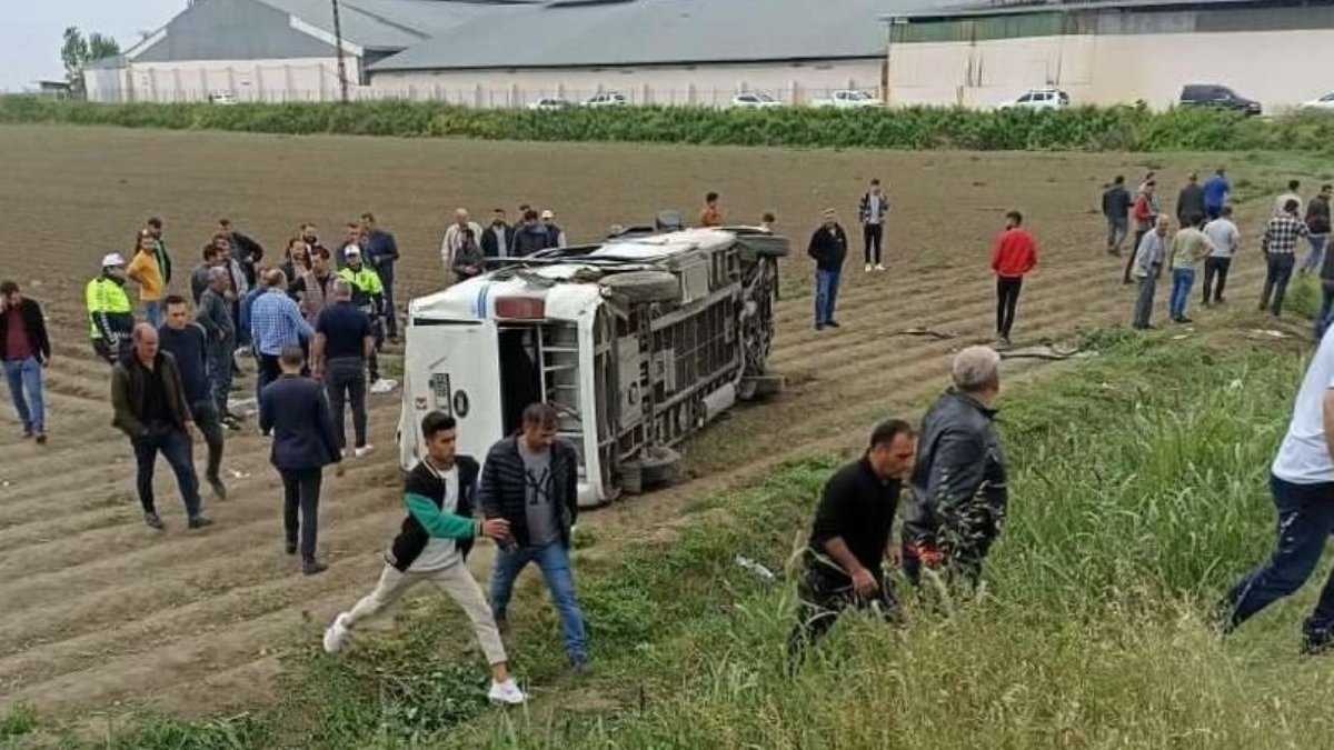 Çarpışmanın etkisiyle minibüs, takla atıp tarlaya savruldu. Kazada sürücü Kanat ile birlikte 10 kişi yaralandı. Yaralılar, kaza yerine çağrılan ambulanslarla hastanelere sevk edildi. Kaza, güvenlik kamerasına yansıdı. (DHA)