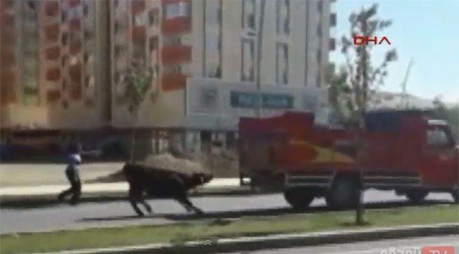 Kamyonun arkasına iple bağlanarak, kesime götürülmeye çalışılan boğa gitmemek için direndi. Bir süre direnen boğa gücünü kaybedince yere düştü. Kurbanlık boğa yere düştükten sonra kamyonet yoluna devam etti. Kamyonete bağlı halde bulunan kurbanlık yerde sürüklenerek götürülmesi amatör kamera tarafından böyle görüntülendi. DHA