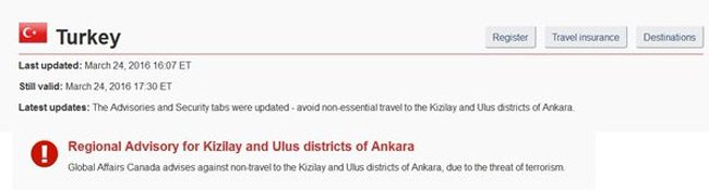 Kanada hükümeti, Türkiye'de art arda yaşanan terör saldırılarının ardından Ankara'daki vatandaşlarına uyarıda bulundu.