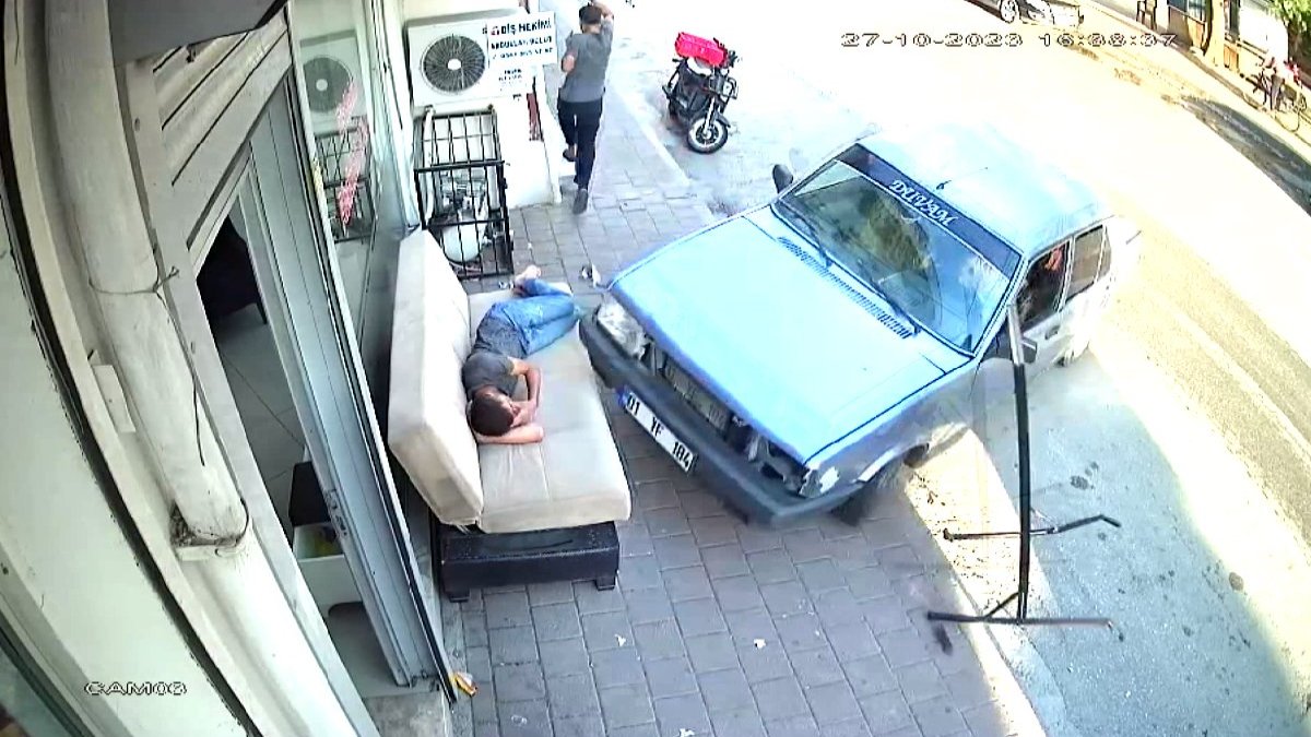 Kaza, dün saat 16.30 sıralarında Yüreğir ilçesindeki Dadaloğlu Mahallesi Şehit Jandarma Er Mustafa Göksal Caddesi'nde meydana geldi. Hızlı olduğu öne sürülen sürücünün kontrolünü kaybettiği 01 YF 184 plakalı otomobil, diş hekimi muayenehanesi ve kanepe tamiratı yapan iş yerinin bulunduğu kaldırıma çıktı. Otomobil, fırıncı Cengiz Adlı'nın yorgun ve hasta olduğu için üzerinde uyuduğu kanepeye çarptı. Adlı, son anda kazadan yara almadan kurtulurken, sürücüsü ise kaçtı.