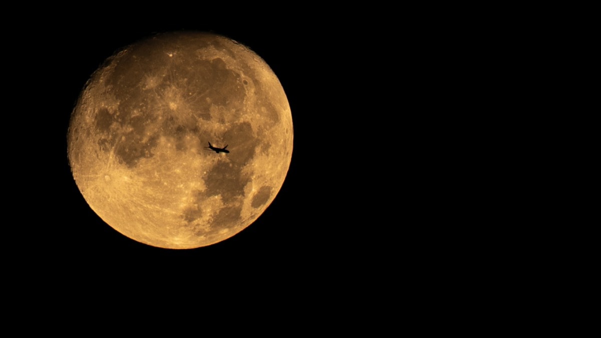 O anlarda ayın önünden geçen bir yolcu uçağı da ilginç görüntüler oluşturdu.
