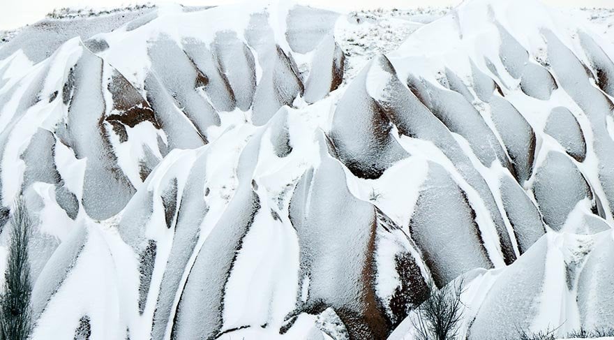 Türkiye’nin önemli turizm merkezlerinden Kapadokya bölgesinde yağan kar yağışının ardından karlarla kaplı peribacaları kendisine hayran bıraktı.