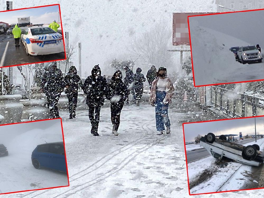 Bolu Dağı geçişlerinde kar yağışı nedeniyle sürücüler, TEM yolu Bolu Dağı Tüneli ve D-100 yolu Bolu Dağı kesiminde, araçlarıyla yavaş ilerlemek zorunda kaldı.