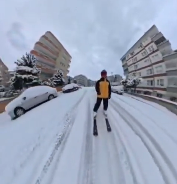 Bursa’nın Mudanya ilçesinde dün etkili olan yoğun kar yağışının ardından yolların karla kaplanması ilginç görüntülere sahne oldu. Sabah saatlerinde işe gitmek için evinden çıkan bir vatandaş, ulaşımda zorluk yaşamamak için kayak takımlarını ayağına geçirerek yola çıktı.