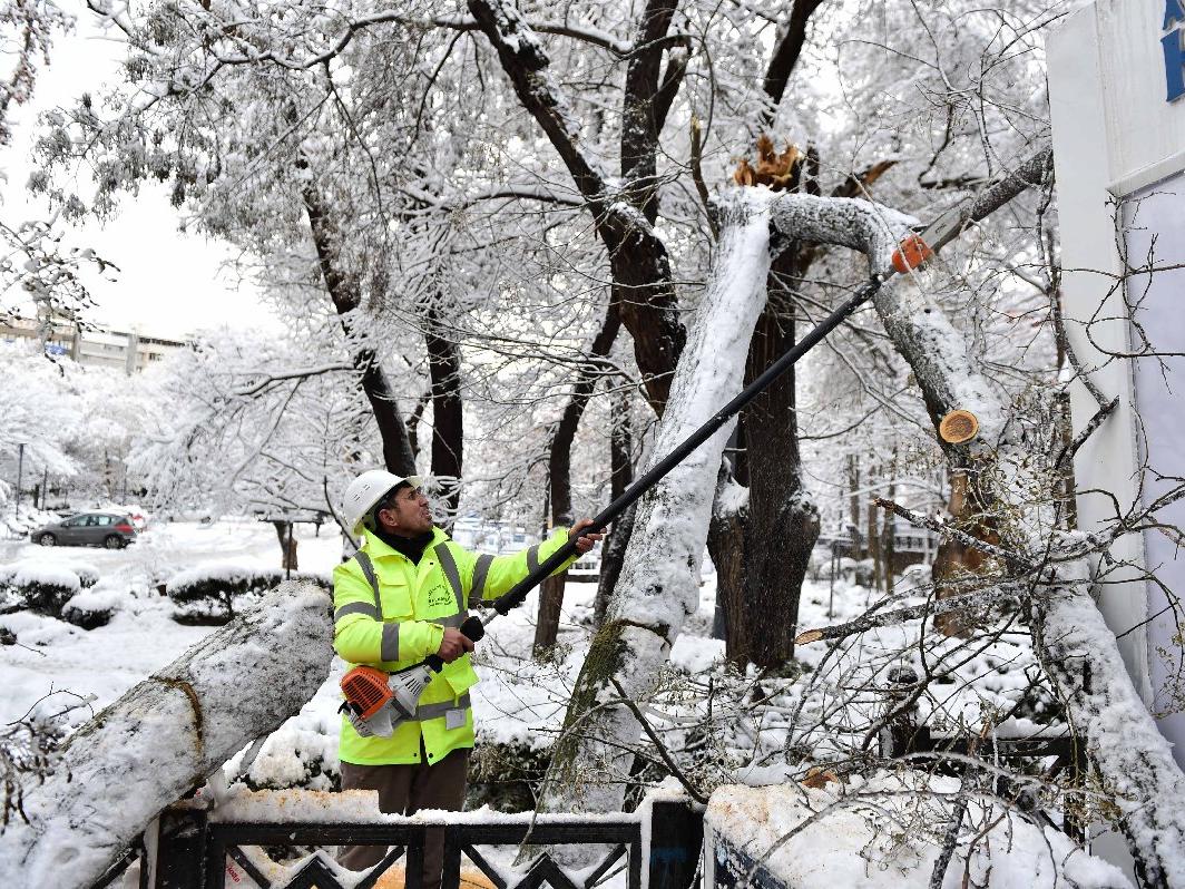 Büyükşehir Belediyesi, yoğun kar yağışı nedeniyle devrilen ağaçları yerinden kaldırırken, olası tehlikeye yol açmaması için de kırılan dalları da tek tek topluyor. Başkent'te etkili olan kar yağışı nedeniyle ilk gün yaklaşık 900 ağacın zarar gördüğü bilgisini veren Ankara Büyükşehir Belediyesi Çevre Koruma ve Kontrol Daire Başkanlığı yetkilileri, karın ağırlığına dayanamayan ağaçların devrilmesi ve bazı dalların da kırılmasıyla ulaşıma kapanan birçok cadde ve bulvarların ekiplerin çalışmaları sonucu yeniden trafiğe açıldığını söylediler.
