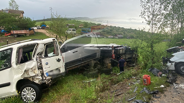Özgür Ş. yönetimindeki kamyon, kontrolden çıkarak önce tali yola giriş yapmak isteyen Mustafa U. idaresindeki hafif ticari araca, ardından karşı yönden gelen Sabri B. (44) yönetimindeki minibüse çarptı. Çarpışmanın etkisiyle kamyon yol kenarındaki tarlaya devrildi. Bu sırada kontrolden çıkan hafif ticari araç, karayoluna çıkmak isteyen kamyonetle çarpıştı.