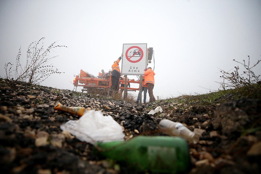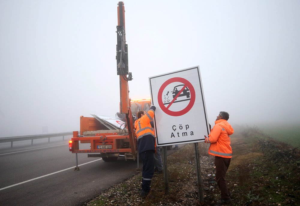 Karayolları Genel Müdürlüğünün (KGM) trafik işaret levhaları arasına eklenen "Çöp atma" levhalarının Kırklareli'nde montajına başlandı.