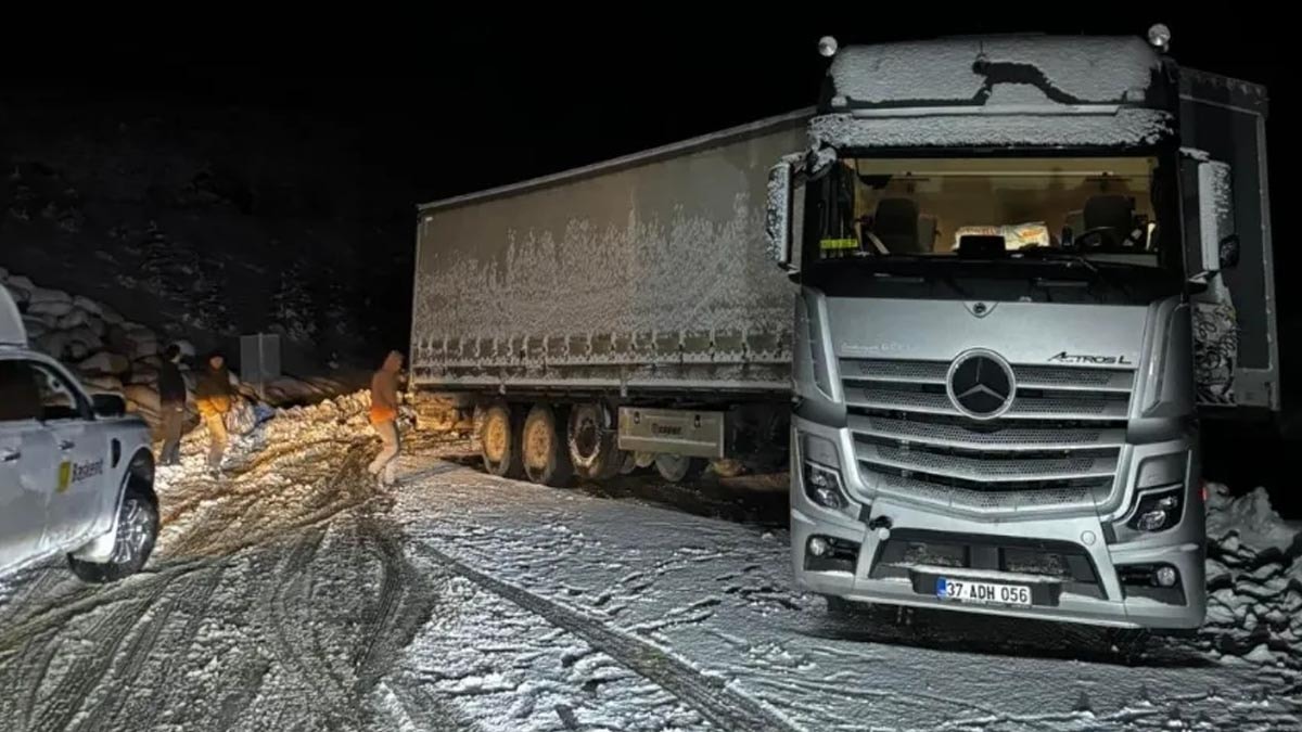 Kastamonu'da etkili olan kar yağışı nedeniyle zor anlar yaşayan sürücüler, Hanönü ile Taşköprü arasında kara yolunun kapanmasına neden olan kayan tırı geçmekte zorlandı. 37 AAY 480 plakalı tır, Hanönü'den Taşköprü yönüne ilerlerken kayarak yolun bir kısmını tamamen kapattı.