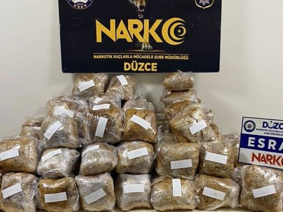 Otoyolun Kaynaşlı mevkisinde durdurulan TIR'ın dorsesinde, kargoların bulunduğu kısımda valizlere gizlenmiş 65 kilo 598 gram esrar bulundu.