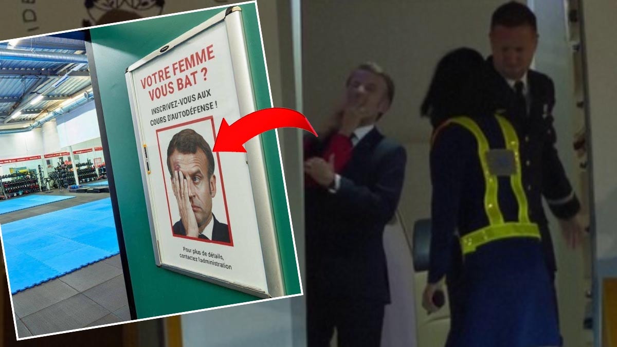 Macron’un görselinin yer aldığı afişte, “Karınız sizi dövüyor mu? Kendini savunma derslerimize katılın!” sloganı dikkat çekti.
