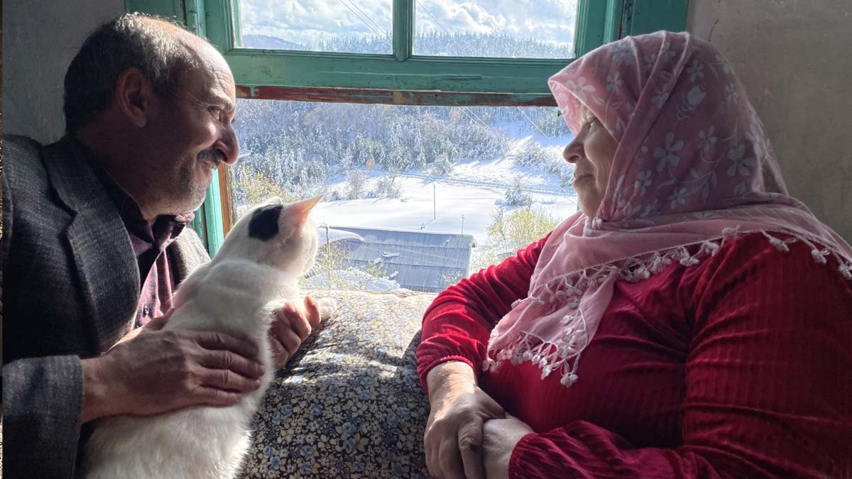 İneklerine bakan, tavuklarını besleyen çift, evde de kedileriyle vakit geçiriyor.