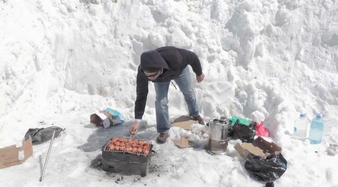 Deniz seviyesinden 2 bin 500 metre yükseklikteki Çavuş Tepe'de çalışmaları aralıksız sürdüren karla mücadele ekipleri, öğlen yemeğini mangal yaparak keyfe dönüştürüyor. Yaklaşık 3 metre kar kalınlığının bulunduğu bölgede yol açma çalışması yapan ekipler mangalda ızgara yaparken "Havalar nasıl olursa olsun bizim havamız iyi olmalı. Çünkü bu zorlu mücadeleyi aşmamız lazım. Zor şartlar altında çalışıyoruz. Bunun için yemeğimizi pikniğe dönüştürüp biraz olsun ortamı değiştiriyoruz" dediler.