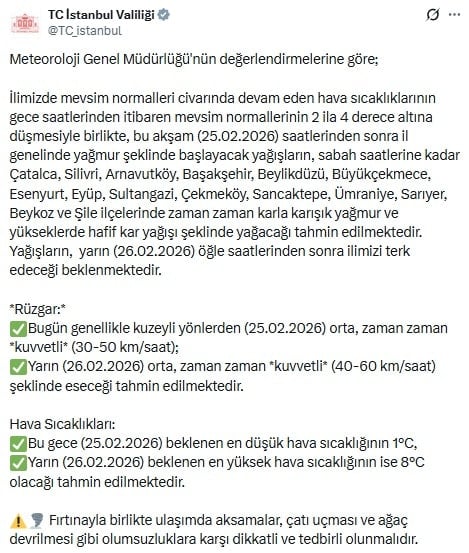 İstanbul Valiliği, kent genelinde etkili olması beklenen soğuk hava ve kuvvetli rüzgara karşı vatandaşları uyardı. Yapılan açıklamada, 25 Şubat 2026 akşam saatlerinden sonra başlayacak yağışların sabaha kadar bazı ilçelerde karla karışık yağmur ve yer yer hafif kar şeklinde görülebileceği belirtildi.